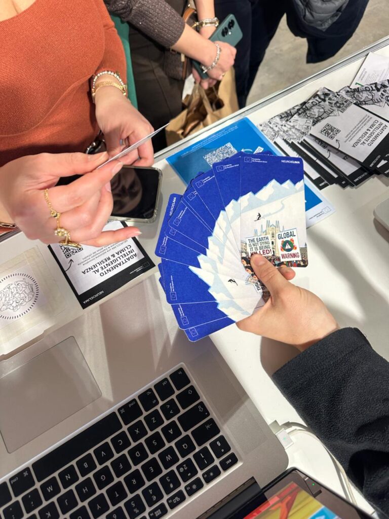 The idea was to see what happens when people are guided to reflect on climate not with a lecture, but through a short process: an initial survey, a game with ten information cards from the NEUROCLIMA toolkit, a reflection on the Deliberate platform, and then a final survey. Nothing complicated, but different enough from the norm to spark curiosity from those who happened to be at our stand.
